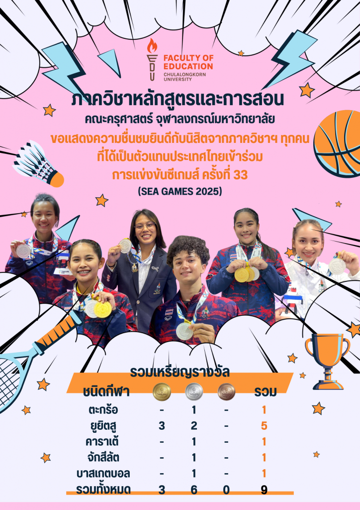 ขอแสดงความชื่นชมยินดีกับนิสิตจากภาควิชาฯ ทุกคน Submitted by CUEDU_CURR on 29 December 2025 ภาควิชาหลักสูตรและการสอน คณะครุศาสตร์ จุฬาลงกรณ์มหาวิทยาลัย ขอแสดงความชื่นชมยินดีกับนิสิตจากภาควิชาฯ ทุกคน ที่ได้เป็นตัวแทนประเทศไทยเข้าร่วม การแข่งขันซีเกมส์ ครั้งที่ 33 (SEA GAMES 2025)