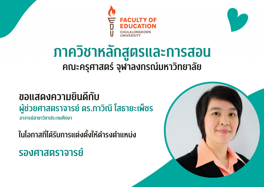 ขอแสดงความยินดีกับคณาจารย์ ที่ได้รับแต่งตั้งให้ดำรงตำแหน่งทางวิชาการสูงขึ้น Submitted by CUEDU_CURR on 2 October 2025 ภาควิชาหลักสูตรและการสอน ขอแสดงความยินดีกับคณาจารย์ที่ได้รับแต่งตั้งให้ดำรงตำแหน่งสูงขึ้น "รองศาสตราจารย์"