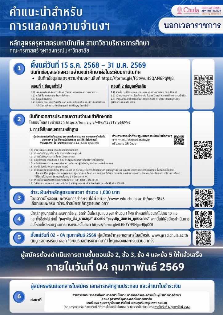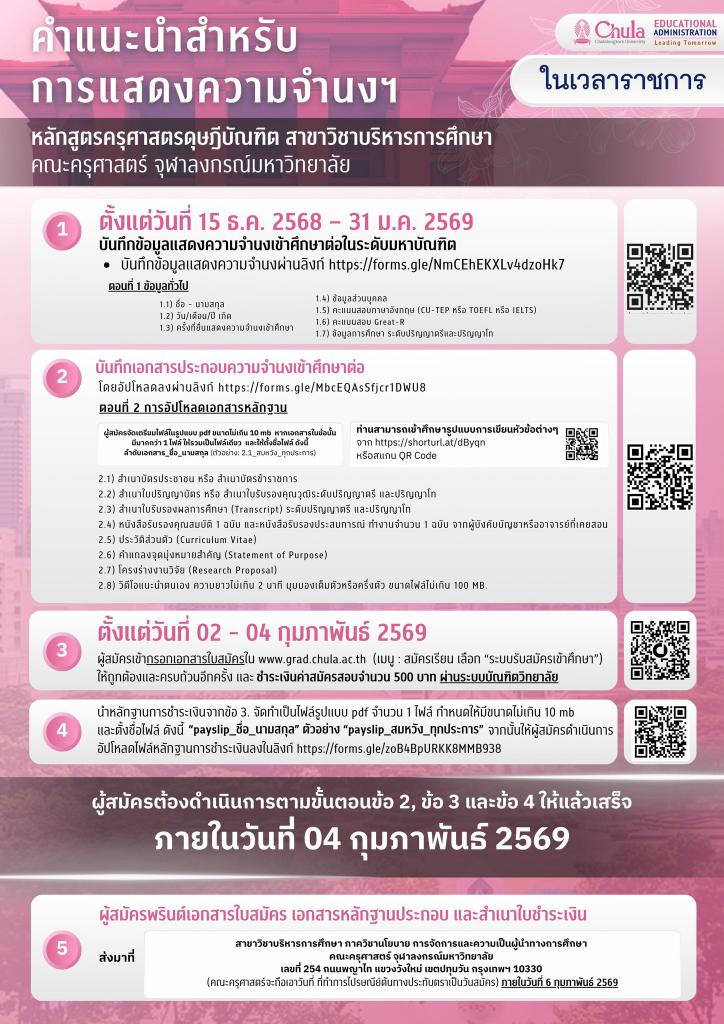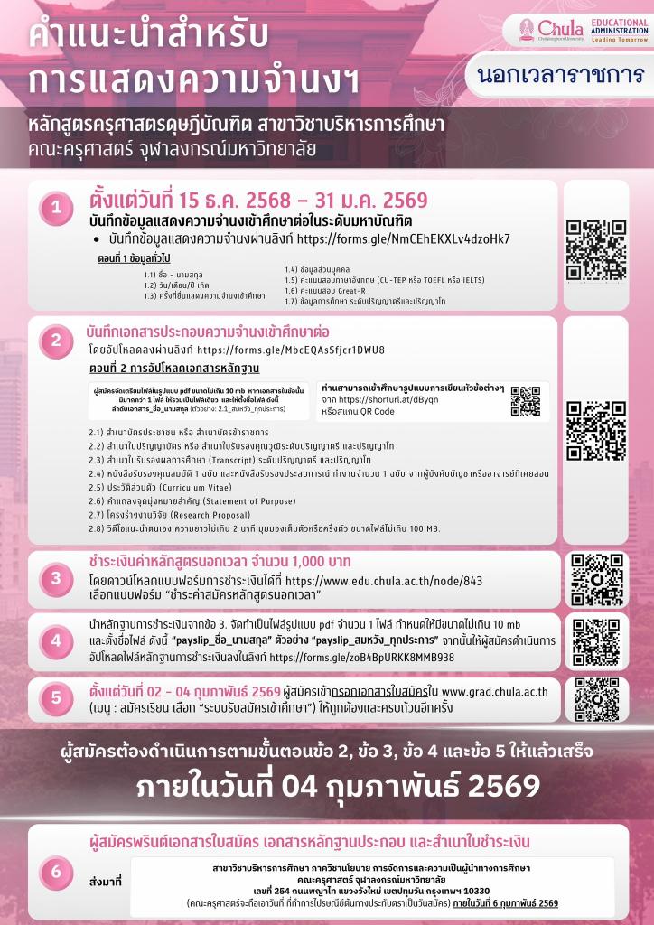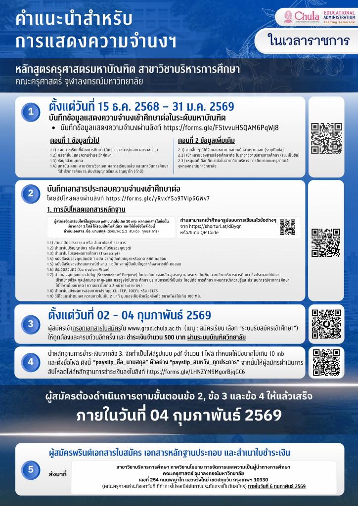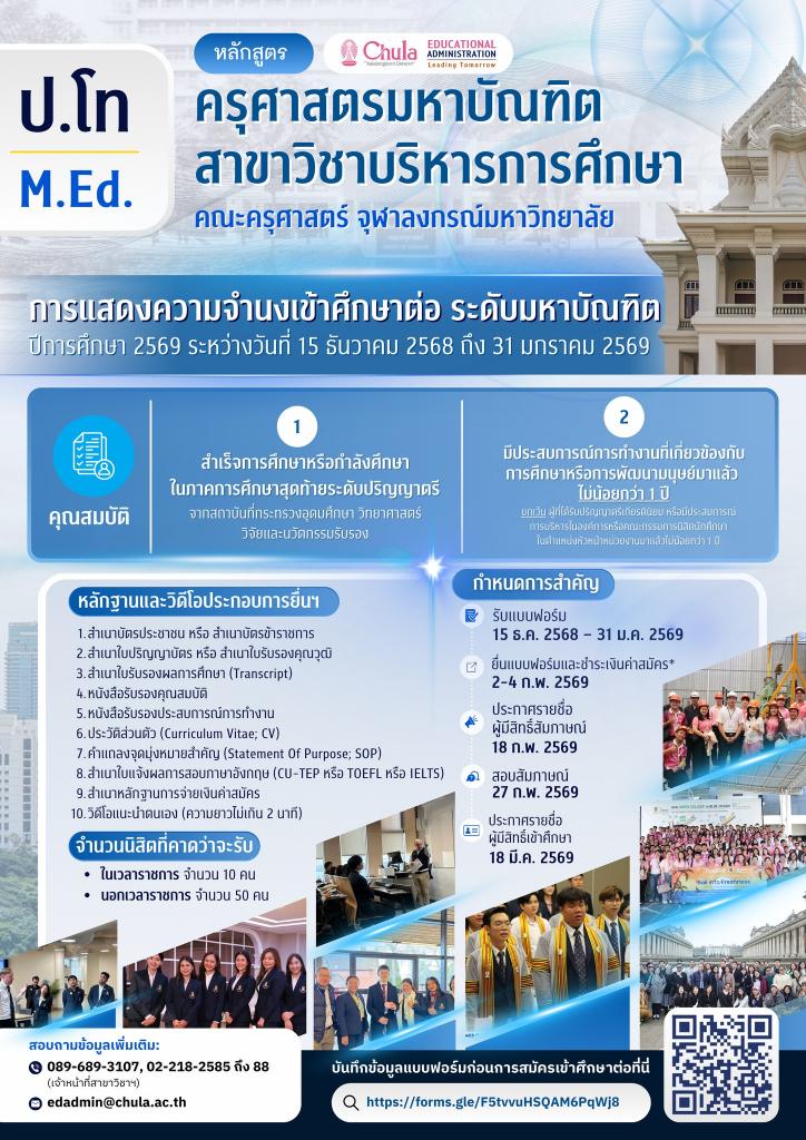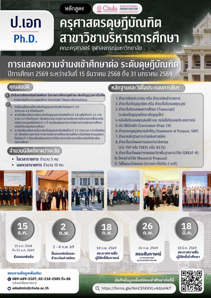 ประกาศรับสมัครนิสิตใหม่ ระดับบัณฑิตศึกษา สาขาวิชาบริหารการศึกษา ภาคการศึกษาต้น ปีการศึกษา 2569