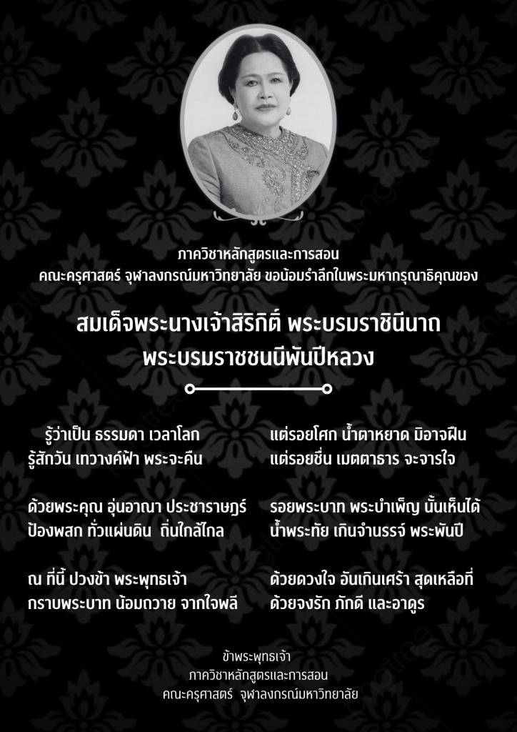 สถิตในดวงใจตราบนิจนิรันดร์ Submitted by CUEDU_CURR on 25 October 2025 ภาควิชาหลักสูตรและการสอน คณะครุศาสตร์ จุฬาลงกรณ์มหาวิทยาลัย ขอน้อมรำลึกในพระมหากรุณาธิคุณของ สมเด็จพระนางเจ้าสิริกิติ์ พระบรมราชินีนาถ พระบรมราชชนนีพันปีหลวง ข้าพระพุทธเจ้า ภาควิชาหลักสูตรและการสอน คณะครุศาสตร์ จุฬาลงกรณ์มหาวิทยาลัย