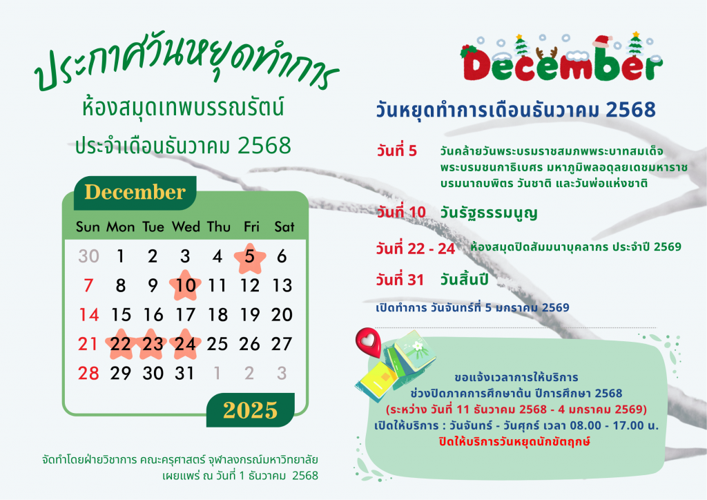 ประกาศวันหยุดทำการ ห้องสมุดเทพบรรณรัตน์ ประจำเดือนธันวาคม 2568