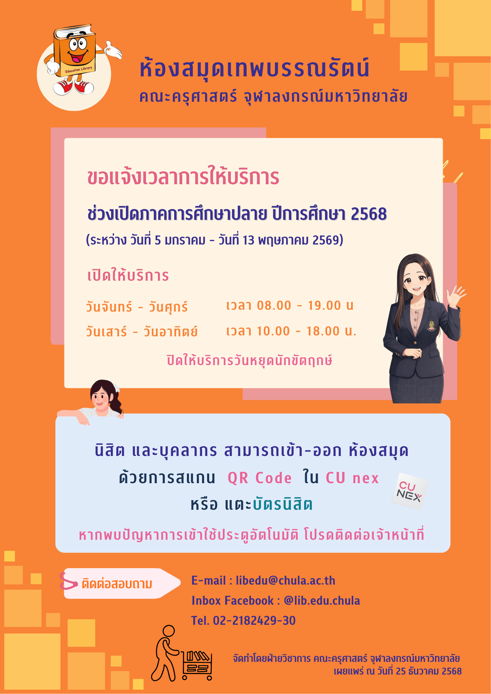 ห้องสมุดเทพบรรณรัตน์ ขอแจ้งเวลาการให้บริการช่วงเปิดภาคการศึกษาปลาย ปีการศึกษา 2568