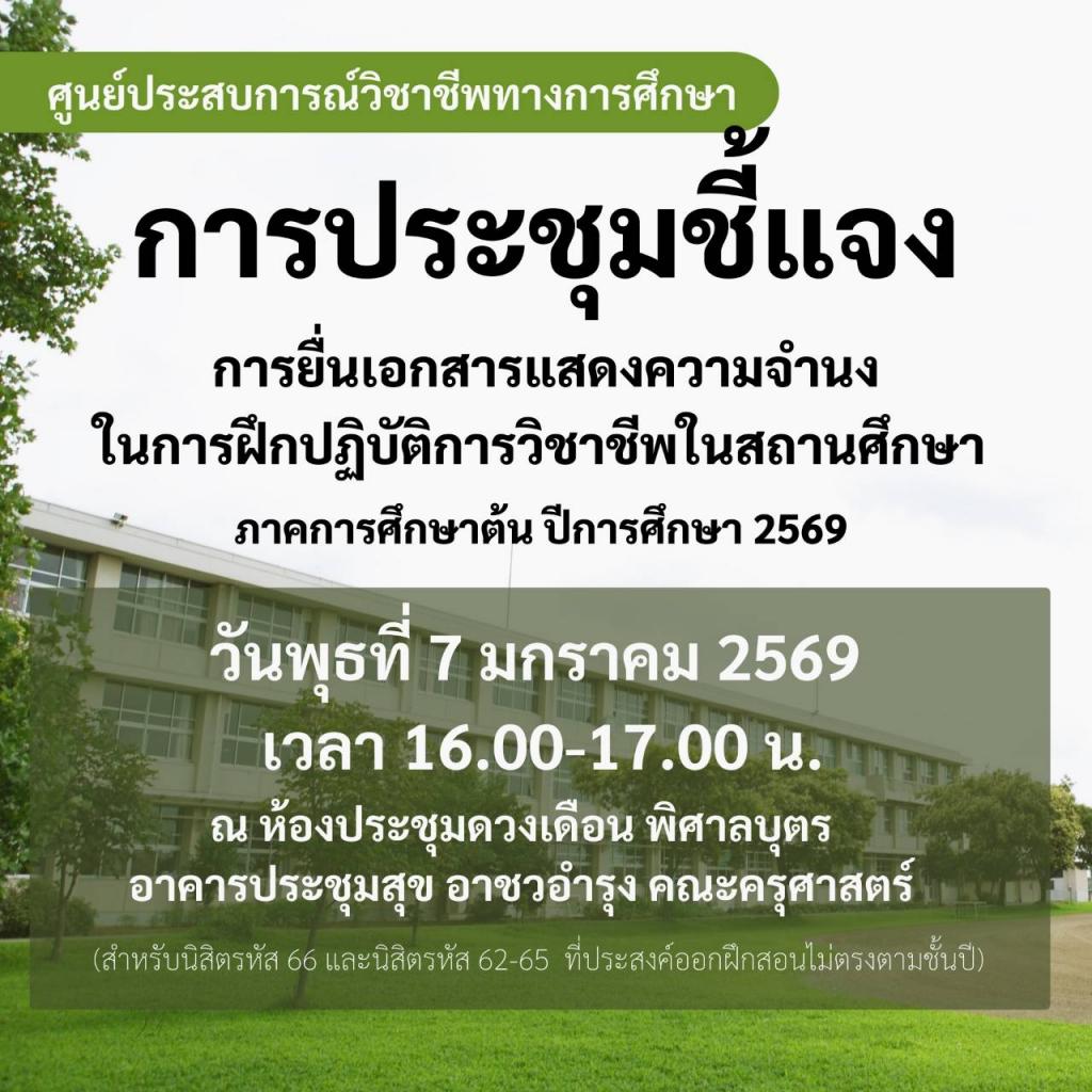 การประชุมชี้แจง การยื่นเอกสารแสดงความจำนงในการฝึกปฏิบัติการวิชาชีพในสถานศึกษา ภาคการศึกษาต้น ปีการศึกษา 2569 Submitted by CUEDU_PROF on 5 January 2026